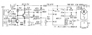 Усилитель НЧ работает на динамик от того же телевизора. Источник питания не стабилизированный. сделан на китайском маломощном силовом трансформаторе «ALG», на первичное напряжение 220V (или 230V), на вторичное 12V и ток в нагрузке 800 mA. Такие трансформаторы очень часто встречаются в продаже. Большинство деталей (кроме магнитной антенны, переменного конденсатора и трансформатора) взяты от того же телевизора. Конденсаторы С4 и С6 на напряжение не меньше 16V.